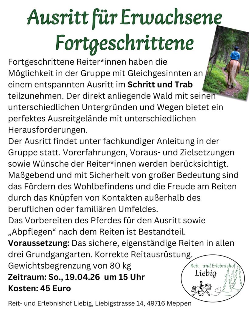 Fortgeschrittene Erwachsene haben die Möglichkeit in der Gruppe mit Gleichgesinnten an einem entspannten Ausritt im Schritt und Trab teilzunehmen. Der direkt anliegende Wald mit seinen unterschiedlichen Untergründen und Wegen bietet ein perfektes Ausreitgelände mit unterschiedlichen Herausforderungen. Der Ausritt findet unter fachkundiger Anleitung in der Gruppe statt.